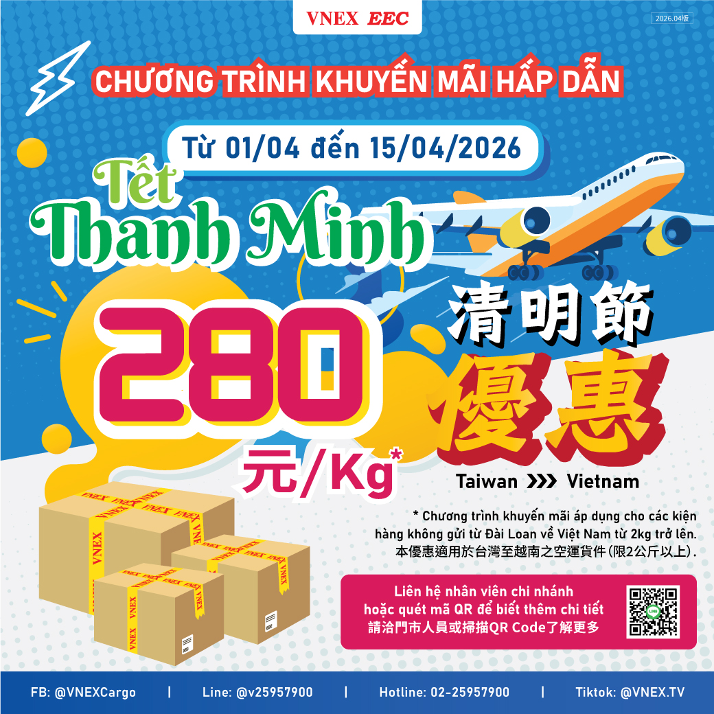 | Cước phí vận chuyển là 180NTD/kg (hàng thông thường), thanh toán tại các chi nhánh VNEX tại Đài Loan sau khi nhận hàng. Nếu muốn nhận tại nhà, phụ thu 100-200 NTD/ kiện phí gửi nội địa Đài Loan. |