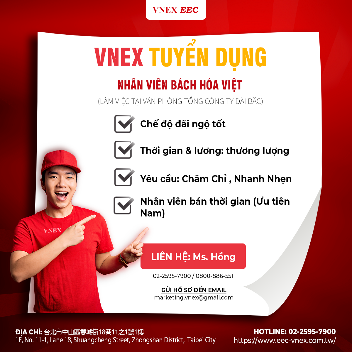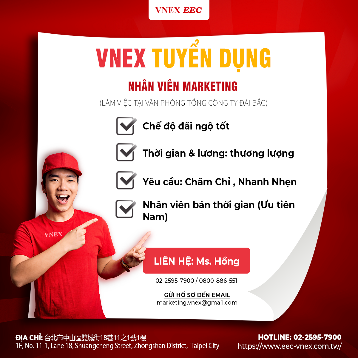 ➤ ĐỊA ĐIỂM 1 HÌNH THỨC LÀM VIỆC Địa điểm làm việc: Tổng công ty VNEX Địa chỉ: 台北市中山區雙城街18巷11之1號1樓 Hình thức:Nh&ac .....
